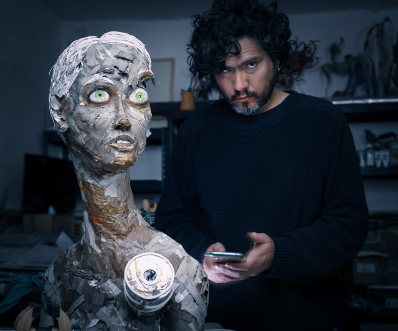 His work centers on the deconstruction of the figure, translating mass-media iconography and material waste (cardboard, newspaper) into complex forms. His current thesis explores the tension between the body's fragility and its contemporary status as a Biological Machine (Metamorphosis), often confronting the figure with the Manufactured Ideal (The Nude and the Beast).