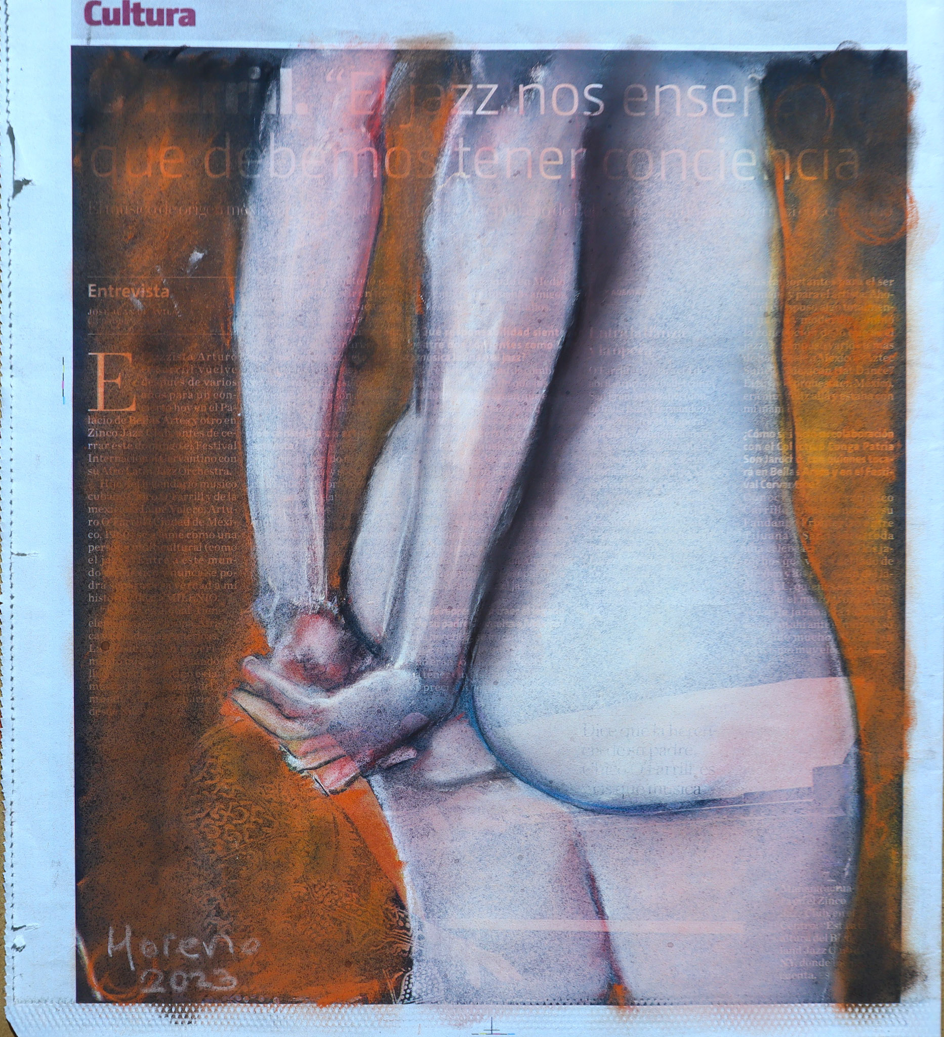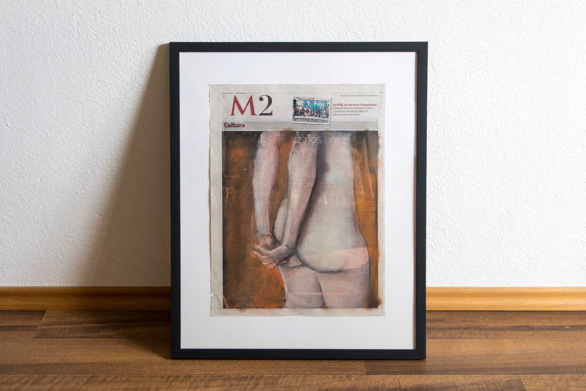 Concept: Consumption, fetish, and the intervention of desire. The erotic figure is superimposed onto the political news story, yet the printed word "DESEO" from the newspaper remains visible, intentionally incorporated as a conceptual driving force. Charcoal and pastel contrast the ephemeral nature of the newsprint with the emotional intensity and control exerted by desire—both aesthetic and political—over the body's narrative.