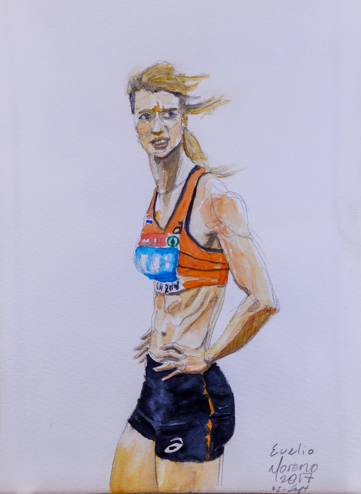 is inspired by the Dutch sprinter Dafne Schippers, captured at the moment of maximum tension post-race, with her hands on her hips.