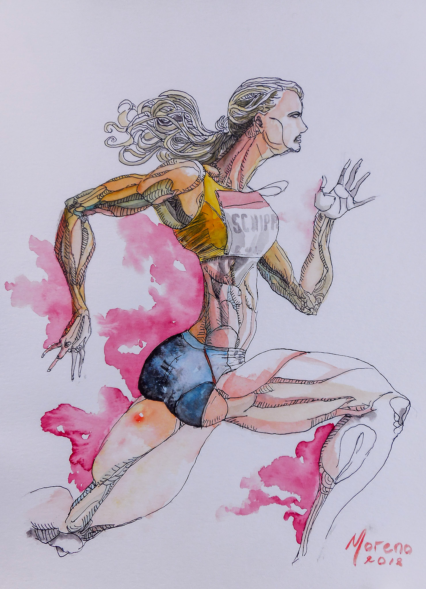 Concept: An exposé of the body as a dynamic machine. The ink lines and watercolor saturation exaggerate the musculature and movement, stripping the runner of her context to transform her into a pure study of kinetic energy. This graphic style establishes the tone of the mythification of the body and the Metamorphosis defined by the series.