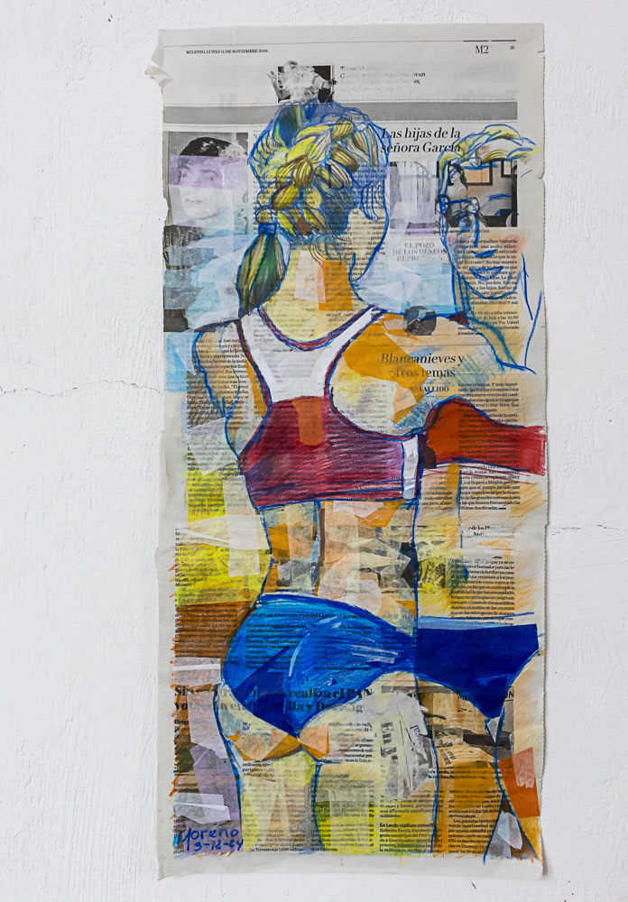 Concept: This piece exemplifies the fusion between the news support and the sports icon. The figure, captured from behind in a moment of tension or concentration, is drawn over the newsprint, allowing the fragmented text to filter through the skin. It is a reflection on how the high-performance body is both an object of discipline and a product of consumption and media printing.