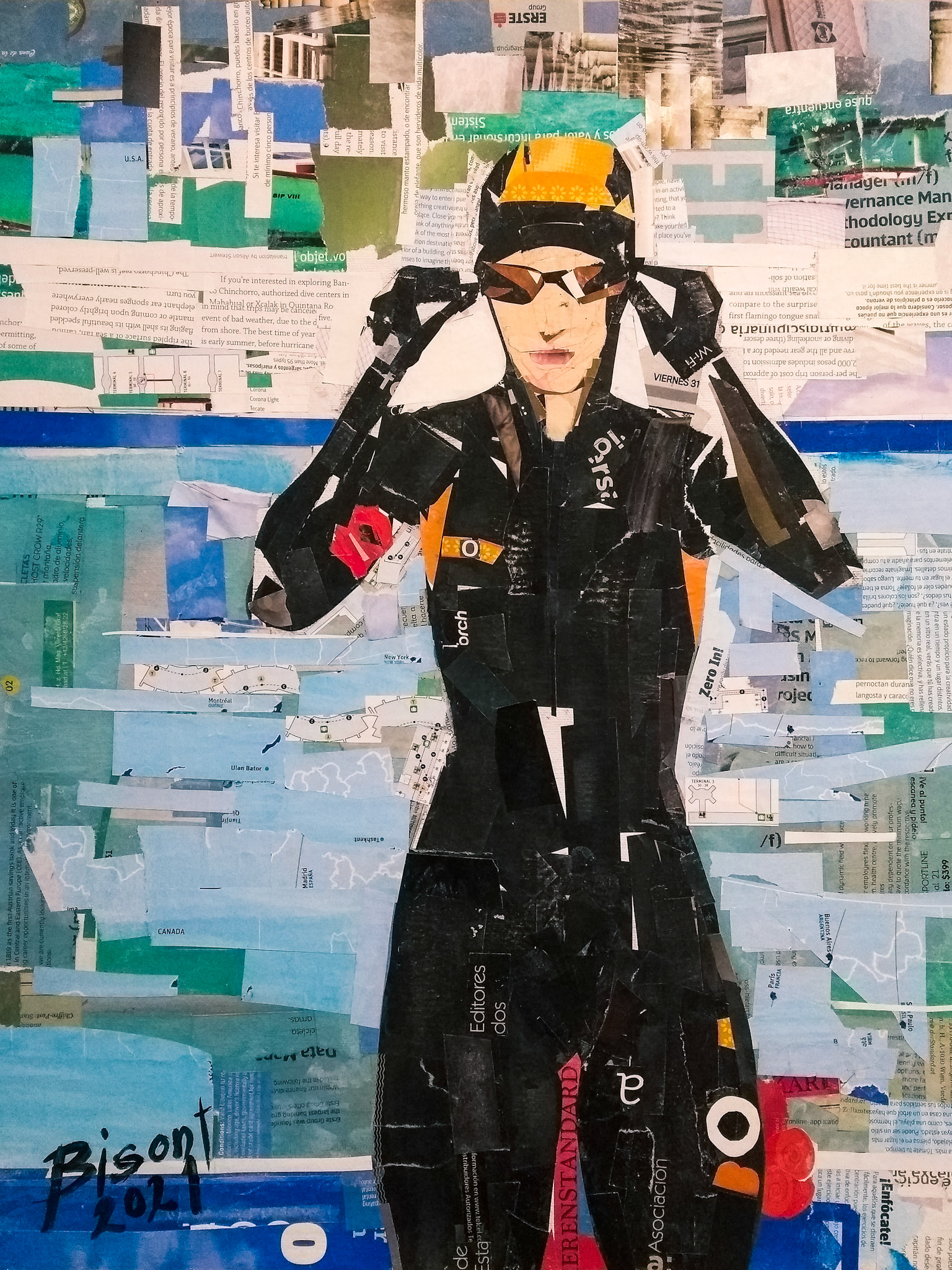 Concept: The speed skater figure, constructed from fragments of discarded newsprint, reflects identity as a composition of media pieces. The collage of newspapers fragments the skin and the environment, anchoring the figure to the discourse of ephemeral matter and visual consumption.