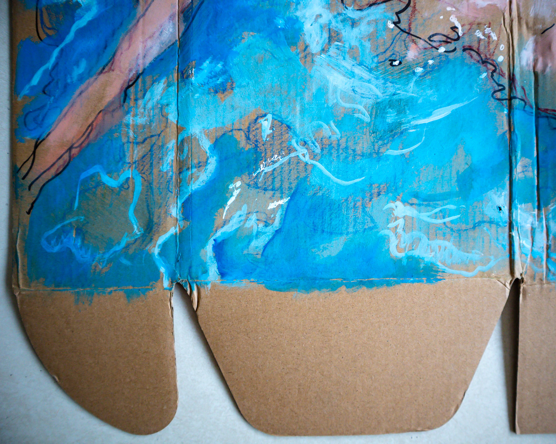 Dimensions: 45 x 68 cm approx. (unfolded) Medium: Assemblage, Acrylic, Charcoal, and Pastel on Cardboard Waste. 2025