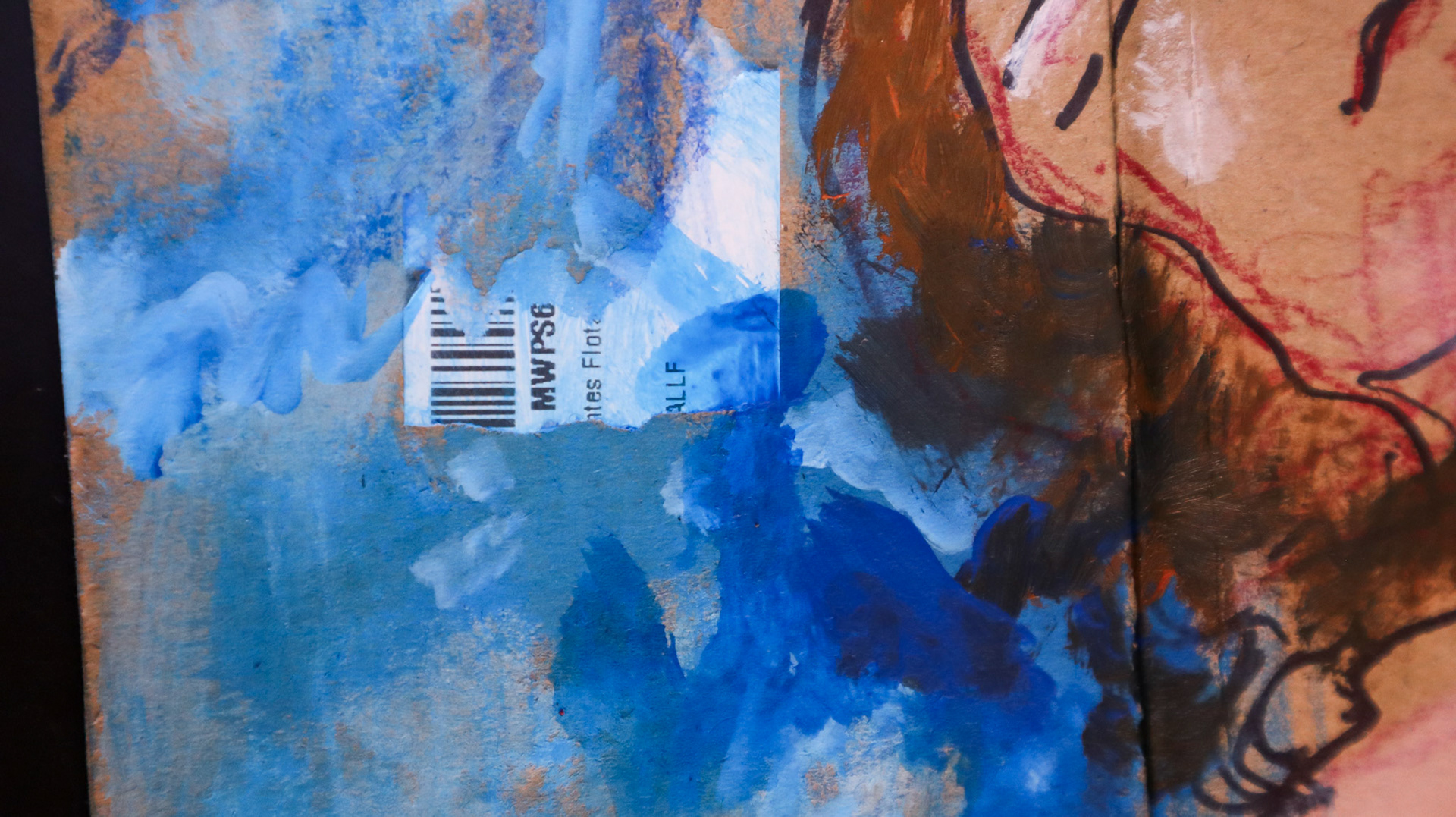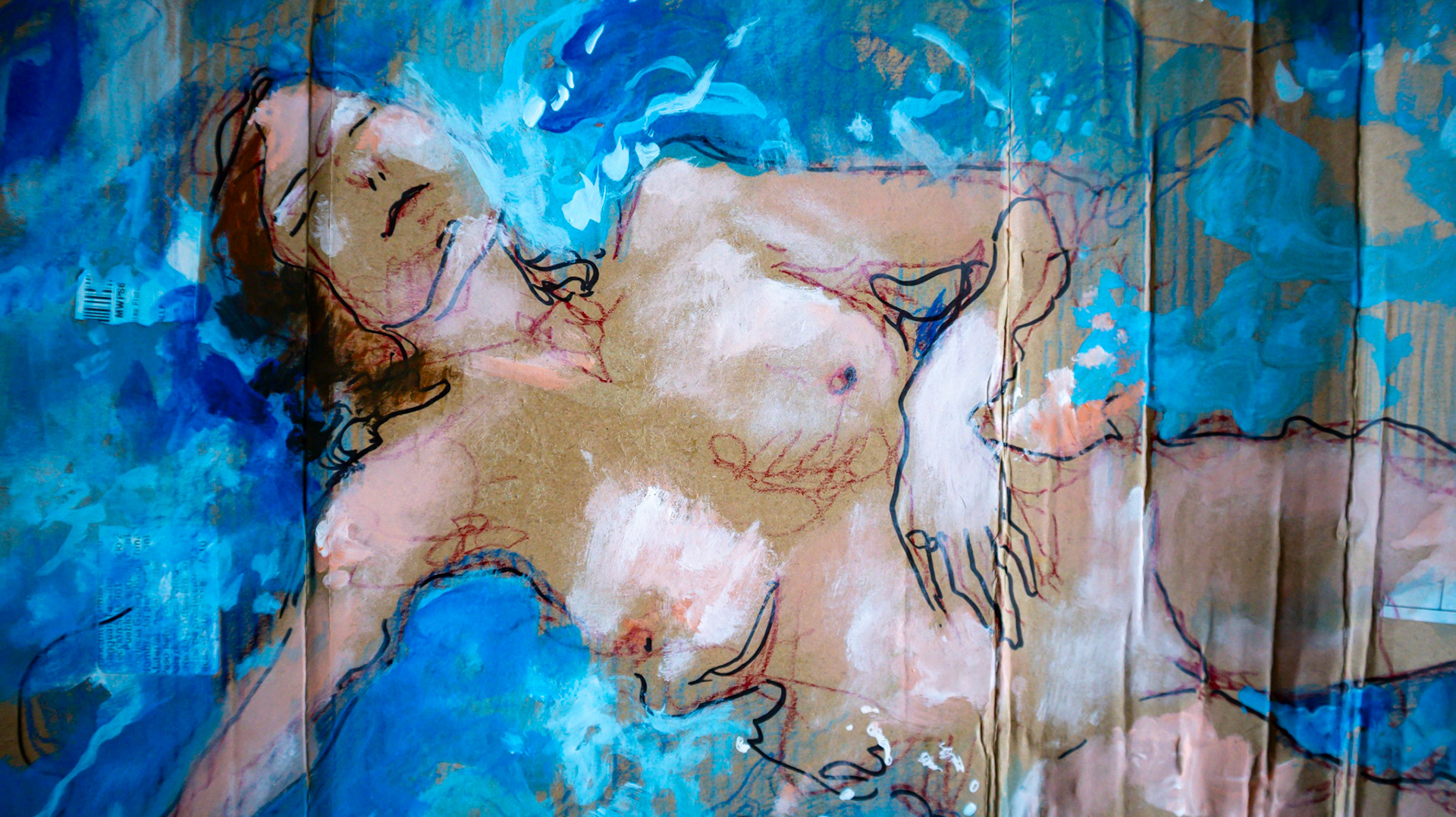 This assemblage exercise on corrugated packaging cardboard (a "skin" of waste) seeks to re-signify the forgotten. The female body here does not succumb but floats; it becomes a map of lines and pigment that dialogues with the barcodes and shipping labels printed on the support.