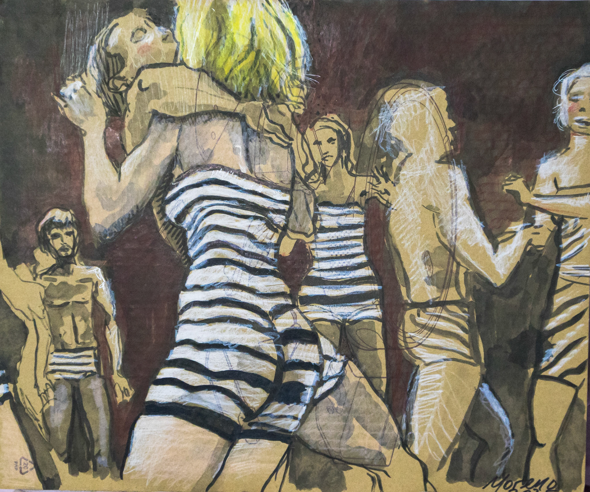 A dystopic study of control and physical obedience. It is inspired by a black and white Scandinavian film, set in a dystopian environment and in some kind of prison where those involved go out to play an extravagant match of some non-existent sport. Executed on discarded cardboard from an autonomous cleaner, the work links this mandated effort to a critique of automation. The use of ink and Prismacolor on this rough material emphasizes the tension between the fluid, dynamic action and the discarded system that governs them.