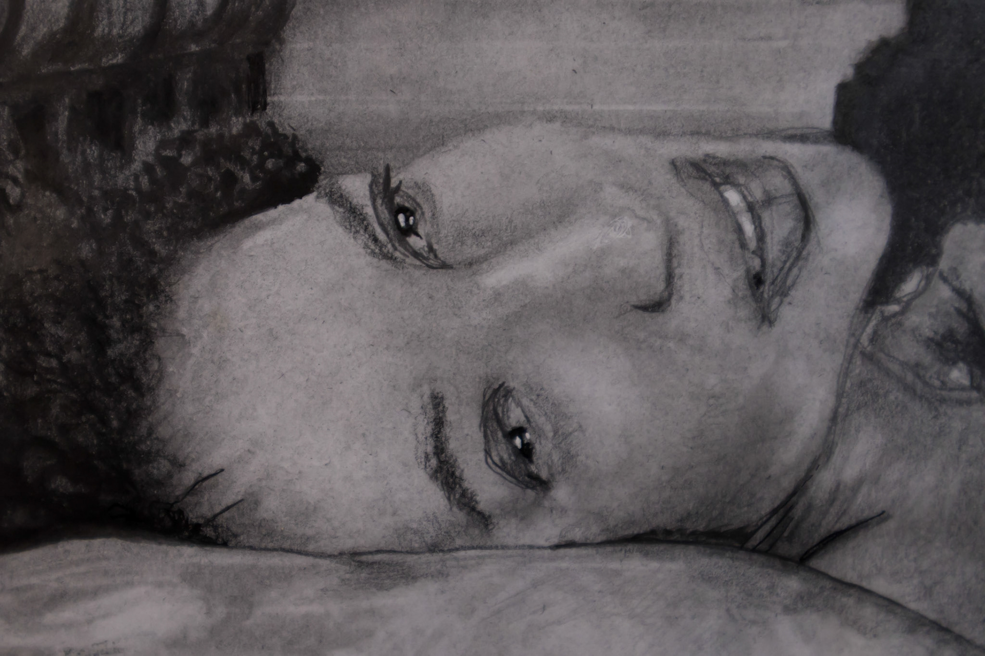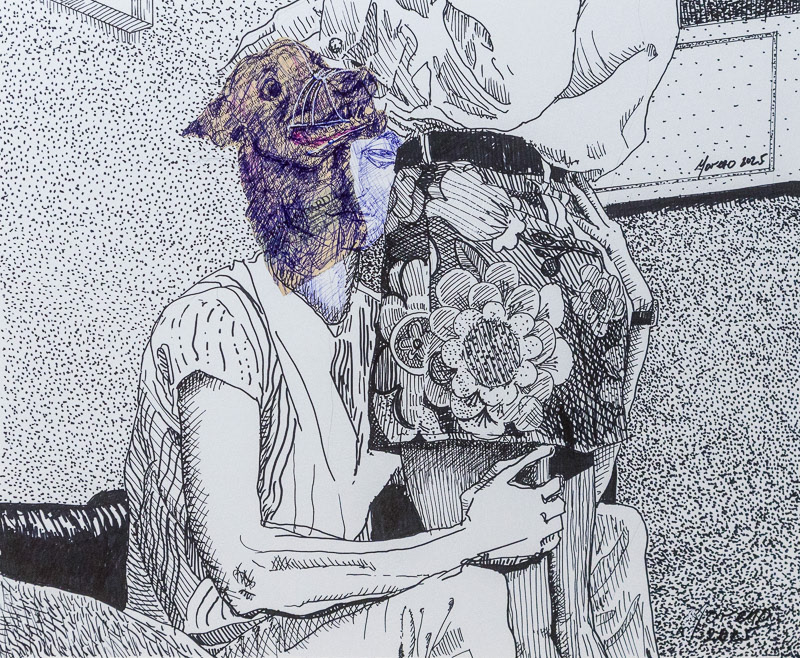A study in psychological noir, reinterpreting classic black-and-white film iconography. The Sharpie drawing technique recreates the interference of an old transmission, where the light is obscured by a domestic object. The figure attempts to hide their identity, but the presence of the Hound of Consciousness (or primal instinct) is revealed, painted directly onto a newspaper substrate. This work investigates the tension between the constructed self and the raw impulse that lies beneath the surface.