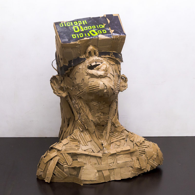 VIRTUAL ECSTASY (Éxtasis Virtual) Addressing themes of dreams and altered realities, Virtual Ecstasy explores the profound impact of digital technology on human desire. Crafted from discarded cardboard, this sculpture depicts a figure in a state of intense sensory arousal, wearing a virtual reality headset. The binary code (01110011 01100101 01111000) subtly integrated into the headset, translates to 'SEX', exposing the interplay between technology, simulated experience, and raw human instinct. The use of recycled cardboard starkly contrasts the ephemeral nature of digital pleasure with the tangible, discarded matter of our physical world.