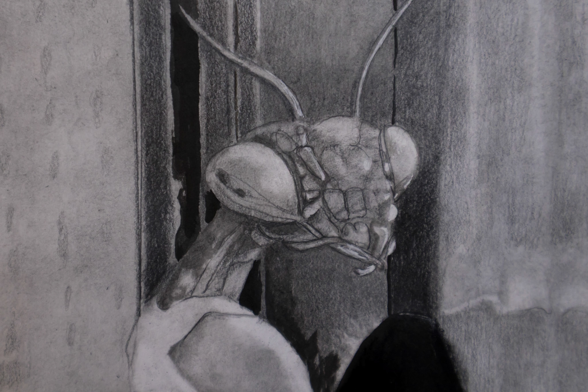 La escena adquiere una tensión kafkiana y psicológica. El artista inserta al insecto gigante, estableciendo un juego de cazador y cazado que juega con el destino biológico de la Mantis. La ambigüedad reside en la pregunta esencial: ¿el acto fatal del 'amante' ya ocurrió, o está por suceder?